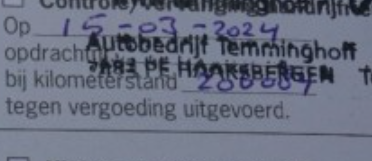 Over die kilometerstand: Het boekje is afgestempeld (foto 32) op 15-3-2024 met een kilometerstand van boven de 200.000 (precieze stand is niet gezien omdat er doorheen is gestempeld). En nu een jaar later is de stand 199997............