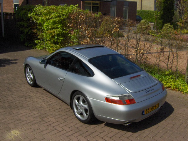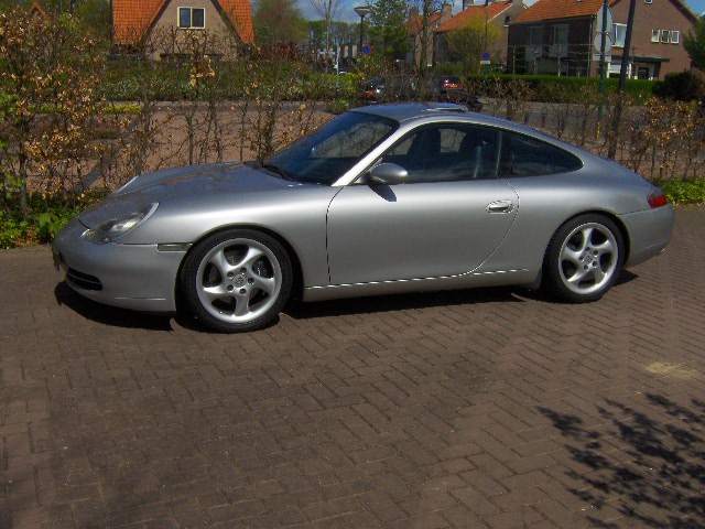 Porsche 911 Carrera 2 3.4 Coupe - Bouwjaar 2001 - Km.stand: 170.928 - APK: 16 mei 2015 - In 2005 door vorige eigenaar geimporteerd uit Duitstand - Bij 48.000 km is de (plof)motor vervangen door een nieuwe motor! - Bij 122.000 km koppeling en drukgroep vervangen - Zilvergrijs met zwart lederen interieur en zwart alcantara hemelbekleding - Handgeschakeld 6-bak - Stoelverwarming - Schuif/ kanteldak - 3-spaaks sportstuur - Xenon koplampen - Volledig H&R instelbaar onderstel - Bij 170.140 km zijn bij H&R in Duitsland de achter schokdempers gereviseerd en afgesteld - Bij 170.000 km onderhoudsbeurt gehad, compleet met Mobil1 olie, airco opnieuw afgevuld etc. - Origineel navigatiesysteem compleet met 6-CD wisselaar - Origineel 18” velgen met goed Continental SportContact2 banden met N2-codering - Bosch Silver-plus accu - Alarm met afstandsbediening en 2 sleutels - Nette auto met recent onderhoud en APK, maar geen nieuwstaat, zo zijn de velgen wat gecorodeerd, zit er hier en daar een krasje en zit er bijvoorbeeld in de aanjager een piep in hogere stand. - Prijs: € 18.450,-