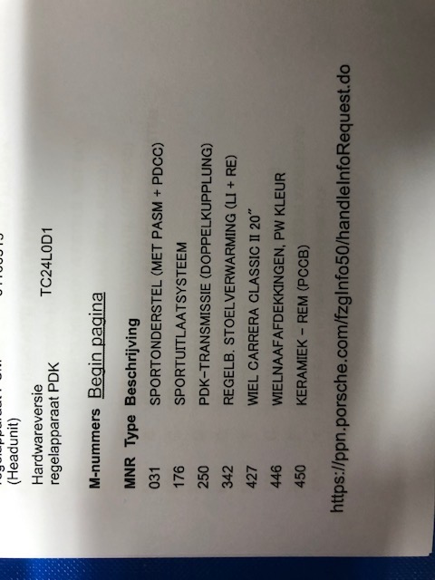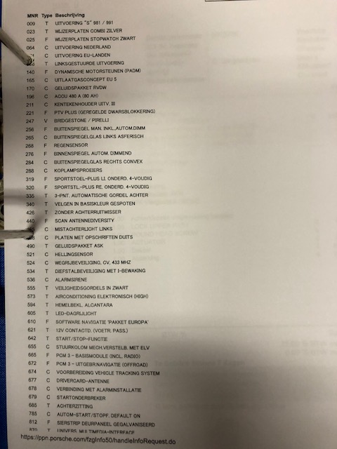 Hierbij de coderingen met optie beschrijvingen. De Porsche is uitgerust met Porsche VTS Klasse 5 alarm.