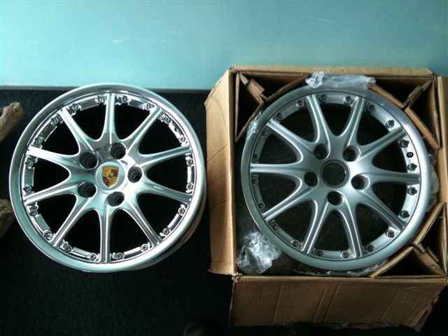 set GT3 Sportdesign velgen voor een Porsche Boxster 2 stuks 7.5X18 + 2 stuks 9X18 velgen zijn net hoogglans verdicht en sindsdien niet gebruikt met nieuwe hoogglans gepolierde wielkapjes met gekleurd porsche logo met nieuwe (ook nooit gebruikt) set Designtek wielbouten (16x) + slotbouten (4x) in inox (dus bijpassend bij deze velgen).