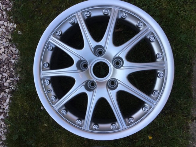 Ik heb nog een setje GT-3 velgen liggen. Origineel BBS. voorzijde 7,5 J x 18 ET 50 achterzijde 10J x 18 ET 65 een velg aan de achtterzijde heeft een kleine beschadiging (zie foto) voor de rest geen (stoeprand)schade. Past op een 996 zonder spacers of een 986 met spacers vraagprijs is 150 euro per velg - gaat alleen weg als hele set.