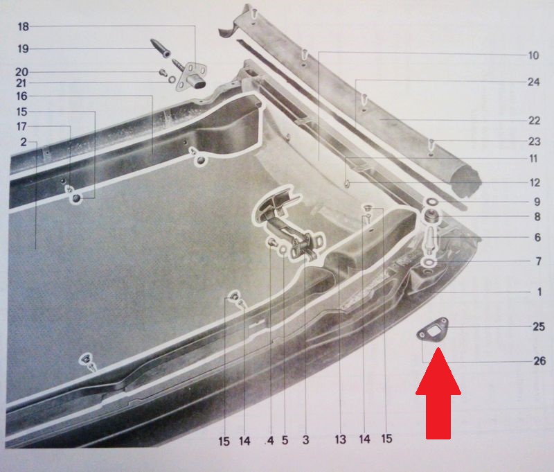 Dak past bij de modellen tot 1976 - 2.7 in de voorkoffer, zie foto, bij latere modellen niet meer wegens de grotere rembekrachtiger. Volgens Pelicanforum hebben Targa’s tot 1981 achter het vinyl nog voorzieningen voor de originele sluiting. Zie foto.