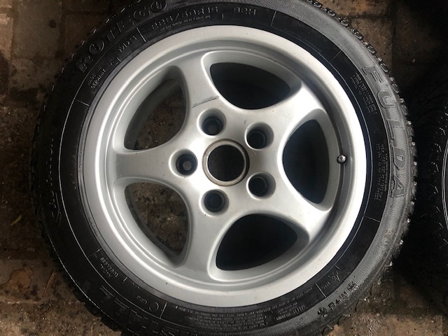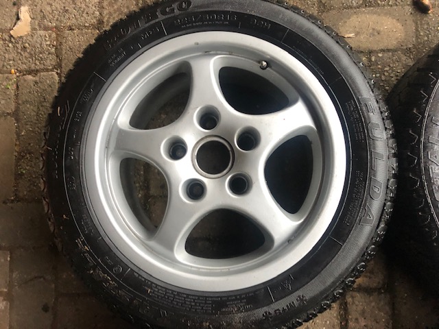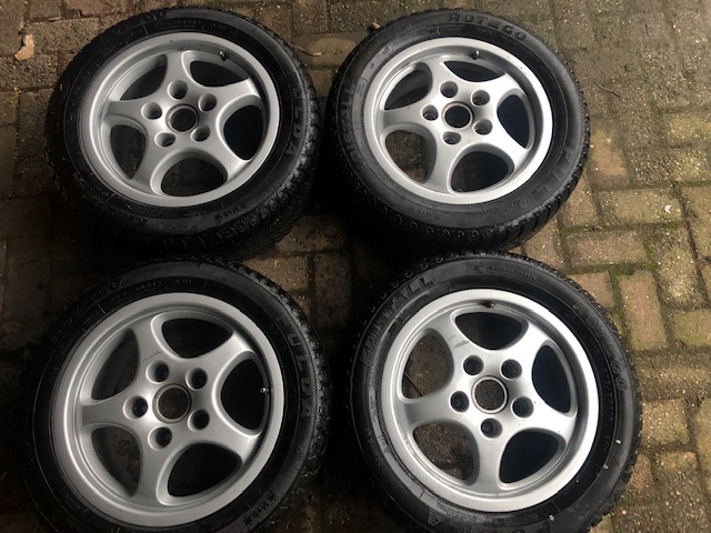 Originele cup porsche velgen 16 inch. De set is voorzien van goede banden. De velgen hebben wat beschadigingen. 2 stuks voor 6jx16 et52 met banden 205/55R16 en 2 stuks achter 8jx16 et 52 met banden 225/50R16. prijs 450 euro