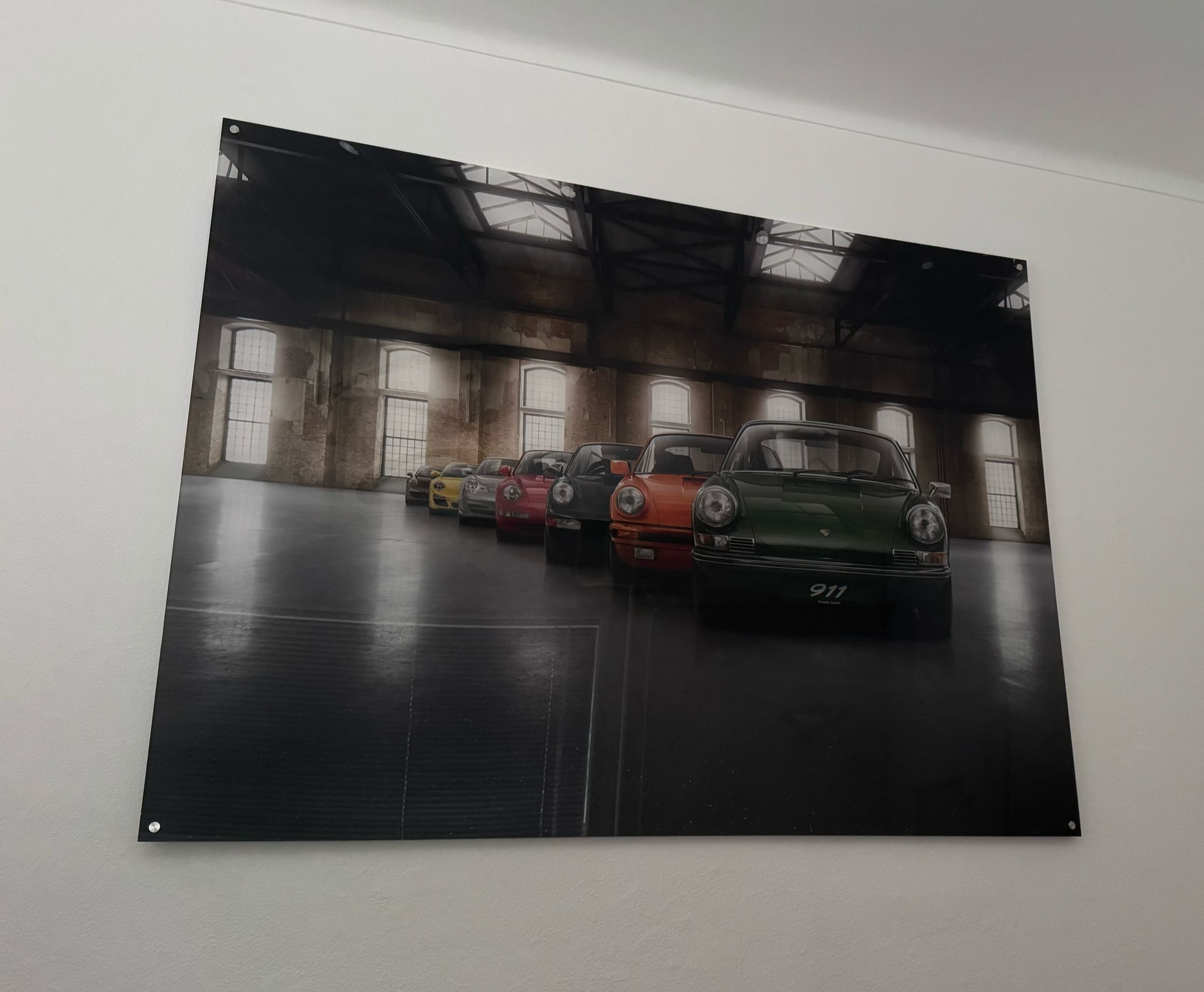 Wegens verhuizing aangeboden een grote print van 6 generaties 911 160 cm x 120 cm. (op foto weerspiegeling van lamp en raam) Afhalen in Amsterdam Zuid, begane grond, parkeren kan voor de deur. Doe een bod.