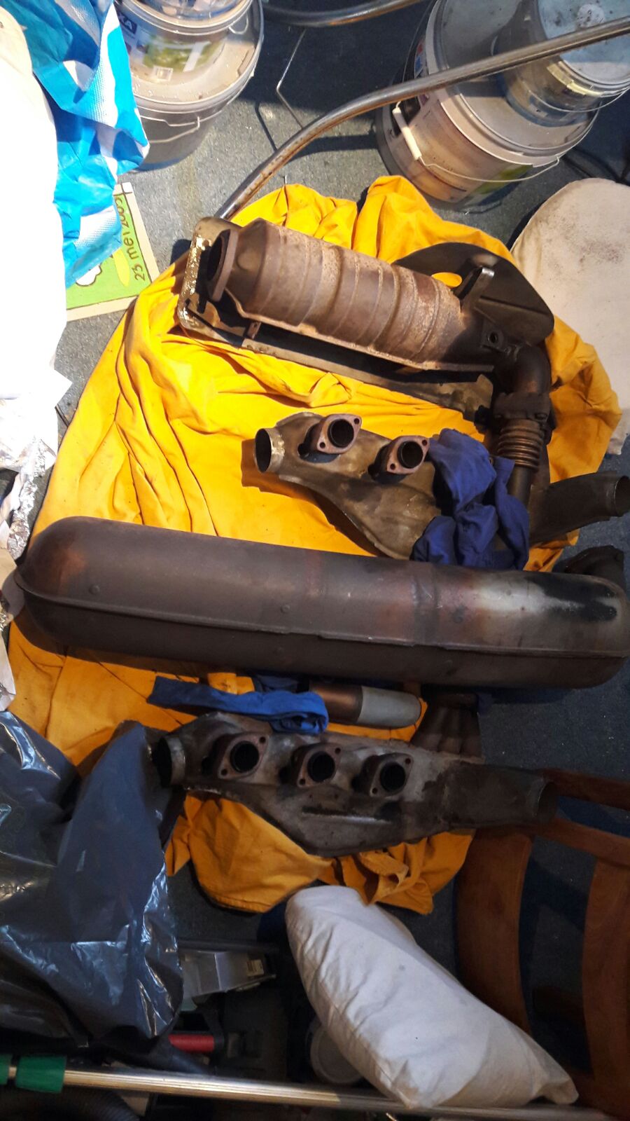 De oude uitlaat ging er vreselijk moeilijk af. Flink stoken steeds bijna bij elke schroef. Maar op een gegeven moment was ie los. Het weegt flink, lijkt wel van een tank die uitlaat. De lambda sonde kwam ook heel lastig los. hij was helemaal aangekoekt, dus flink heet stoken dan maar.. Daarna met veel passen en meten de 1972 potten en einddemper erop. de oude tip paste niet mooi door het gat, dus opnieuw een andere tip erop gezet. De schroeven waren ook te lang (de flens van een 2.4 is dunner)