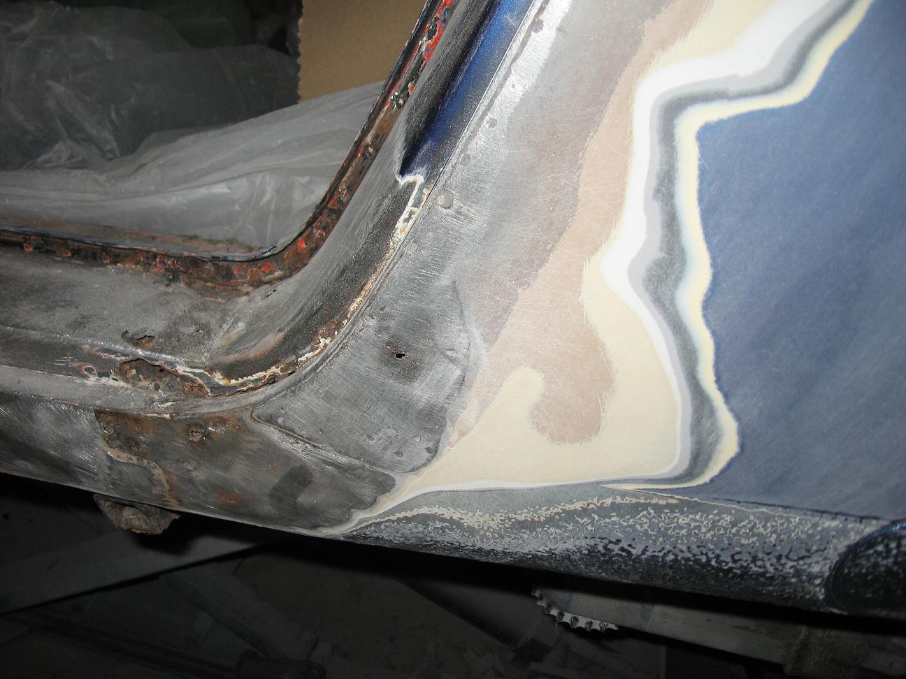 De auto was netjes blauw gespoten, ramen eruit geweest e.d., echter de motor- en kofferruimte waren slecht en zwart gespoten. Daar kon je goed zien dat deze oranje waren geweest.