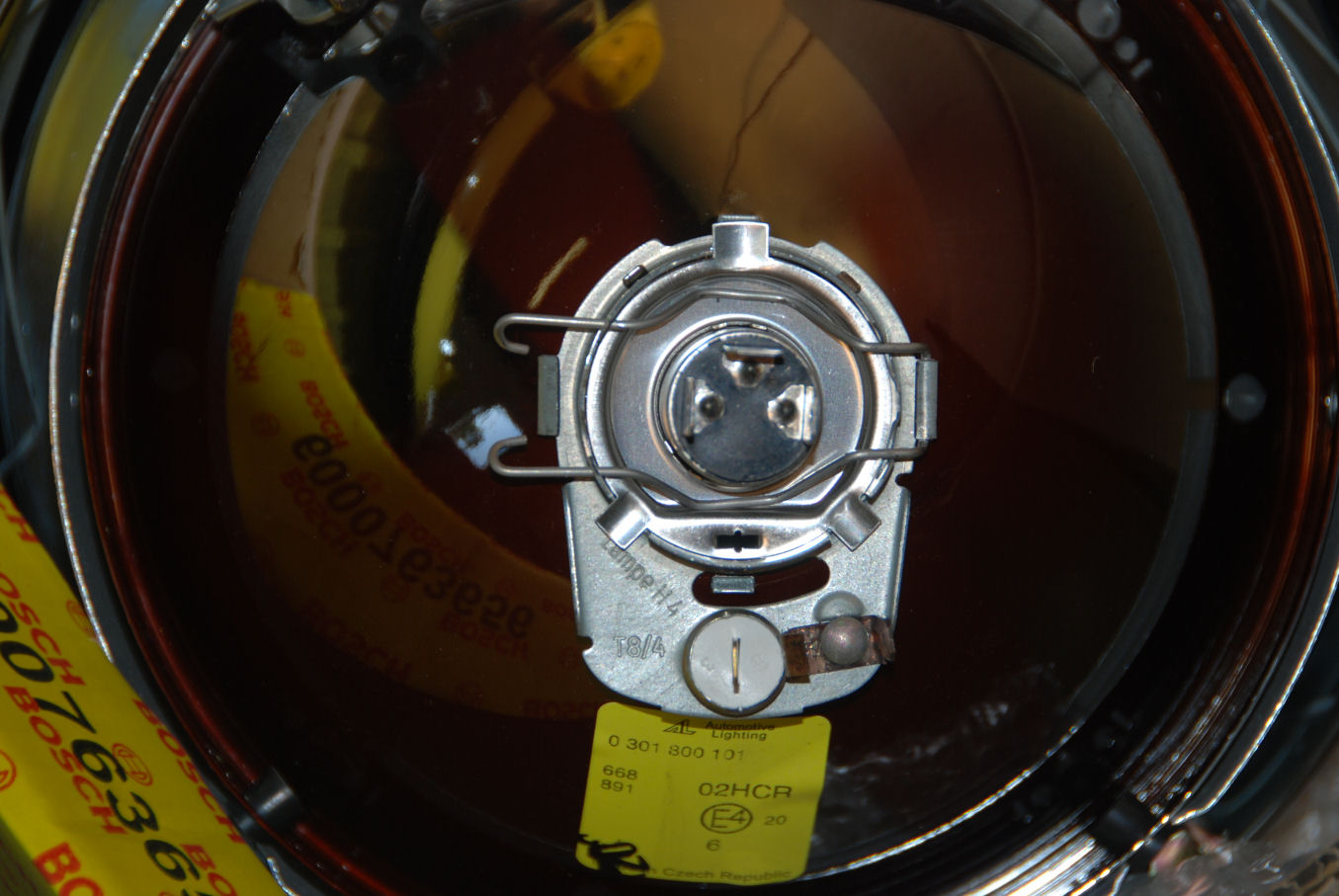 Naar de koplamp gaan 3 draden: wit, geel en bruin (massa) met een stekker die op de Bosch H4 lamp past.