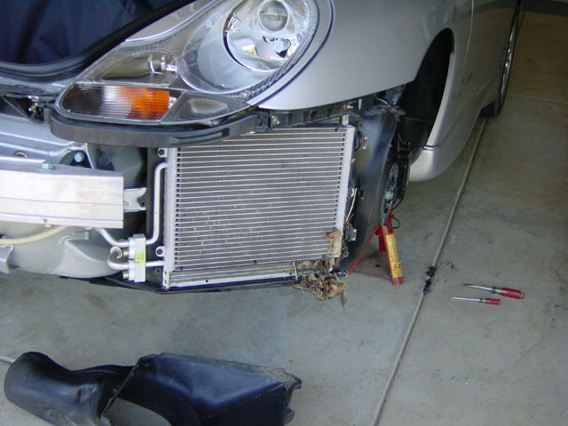 Twee condensors bij een 996 dus neem aan ook bij een Boxter..... Voor het verwijderen van de radiator moet je geloof ik ook de wheel lining weghalen om bij de radiator aansluitingen te komen.