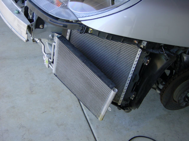 Los van alle milieuaspecten is het niet zo moeilijk. Als er een lek is verdampt het koelmedium meteen dus het zal wel leeg zijn nu. Wat je wel ziet bij een lek is compressor olie wat in het system zit. Vervangen van de condensor is niet zo moeilijk. Er zijn twee condensors gemonteerd voor iedere radiator een, zie de foto’s. Condensor zit vast met 2 torx screws.
