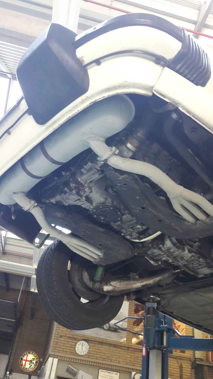 De oude uitlaat ging er vreselijk moeilijk af. Flink stoken steeds bijna bij elke schroef. Maar op een gegeven moment was ie los. Het weegt flink, lijkt wel van een tank die uitlaat. De lambda sonde kwam ook heel lastig los. hij was helemaal aangekoekt, dus flink heet stoken dan maar.. Daarna met veel passen en meten de 1972 potten en einddemper erop. de oude tip paste niet mooi door het gat, dus opnieuw een andere tip erop gezet. De schroeven waren ook te lang (de flens van een 2.4 is dunner)