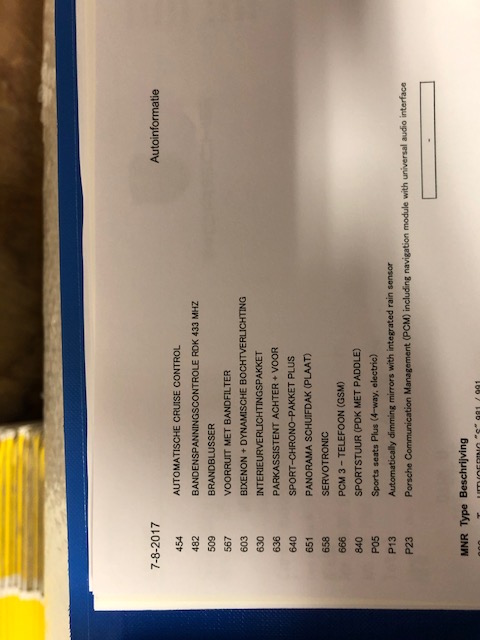 Hierbij de coderingen met optie beschrijvingen. De Porsche is uitgerust met Porsche VTS Klasse 5 alarm.