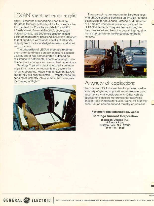 Wegens dubbel bezit verkoop ik één van mijn twee Saratoga Lexan kunststofdaken voor een Porsche 911 Targa van 1974 tot de laatste 964 van 1993, het G-model en het 964 model. Dit was een dure, beperkte optie bij Porsche begin Jaren 80 en slechts in zeer beperkte oplage gemaakt door de firma Saratoga in de USA.