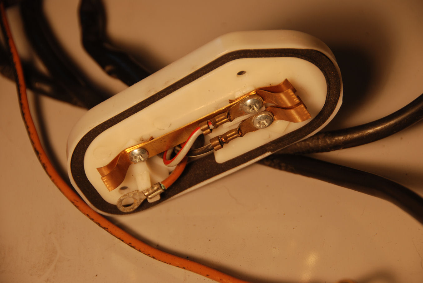 Dit is de achterkant van de boschkoplamp, met twee aansluitpunten. Een voor het dimlicht/grootlicht (bovenste 3 polig) en een voor het stadslicht (onderste, twee polig).