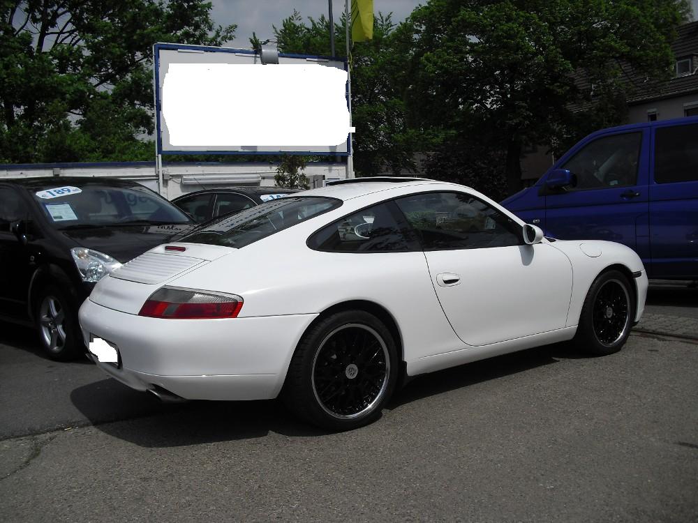 het betreft een 996 Carrera 2 Tiptronic uit (mei) 2001, 2de eigenaar (1ste eigenaar, tot mei 2003, was Porsche Stuttgart), (aantoonbaar) 67000 km op de klok, vrijwel altijd door lokale Porsche-dealer onderhouden, met alle papieren ter inzage. Kleur: metallic groen, een kleur die ik zelf erg mooi vind maar potentieele kopers minder, althans volgens het Autohaus dat de auto (in consignatie) te koop aanbiedt. Om deze reden is de auto 2 maanden terug voorzien van een witte vinyl wrapping. Overigens staat de 996 reeds 5-6 maanden te koop, volgens het Autohaus vanwege de kleur (maar waarschijnlijk ook wegens de economische recessie).