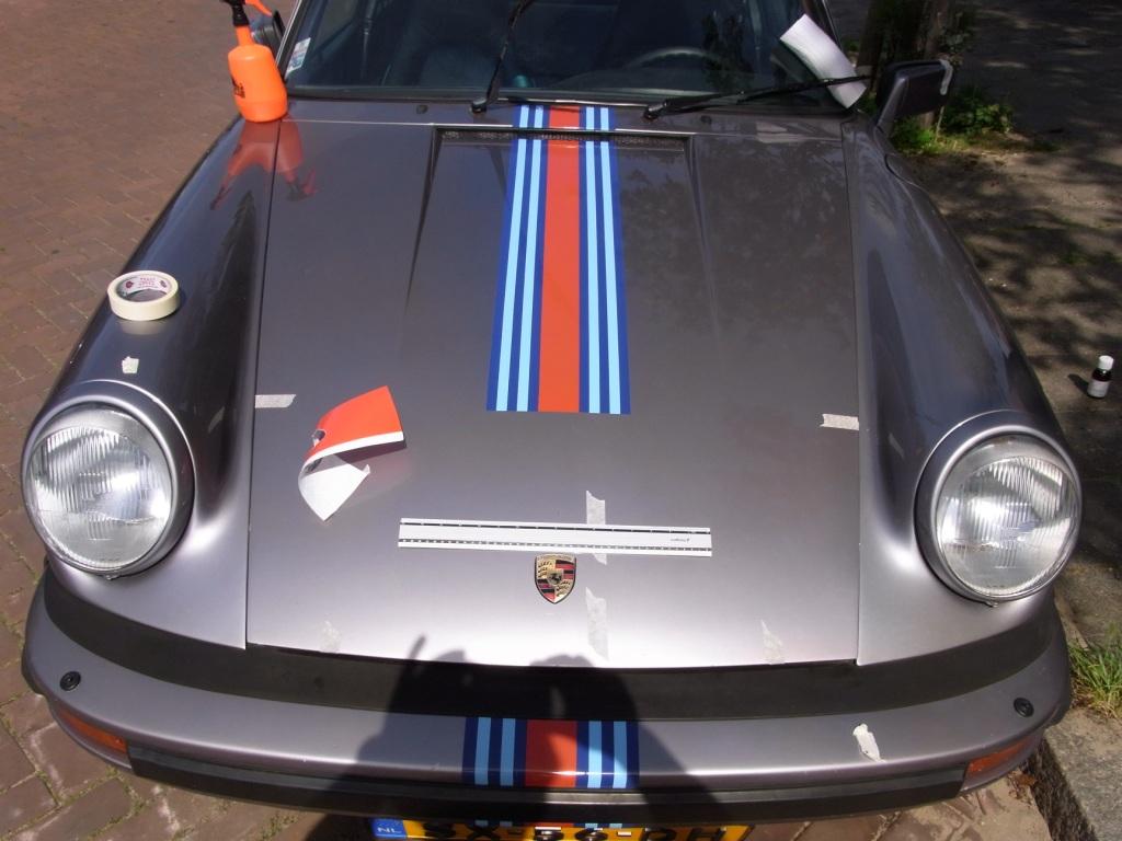 Vandaag striping en grote Martini Racing sticker op motorkap aangebracht. Van 10 tot 21 uur aan het pielen geweest maar aardig gelukt. Enige wat tegenvalt is dat de onderliggende stickerlaag goed te zien is als je er een ander overheen plakt. Van een afstandje maakt dat niet zoveel uit, van dichtbij zie je het wel. En natuurlijk de bubbeltjes, dat maakt het verschil tussen de goedbedoelende amateur en de prof. Morgen met de naald aan de slag om wat bubbeltjes weg te werken.